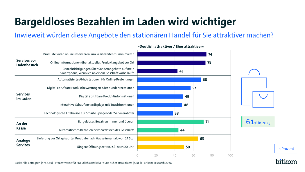Um den stationären Handel aus Sicht der Kundinnen und Kunden attraktiver zu machen, liegen vor dem Bezahlen aber noch Services, die Online- und Offline-Handel verbinden: Knapp drei Viertel (74 Prozent) der Internetnutzerinnen und -nutzer wollen Produkte vorab online reservieren, um Wartezeiten im Laden zu minimieren, 73 Prozent wollen vorab Online-Informationen über das aktuelle Produktangebot vor Ort abrufen können. 68 Prozent wünschen sich automatisierte Abholstationen für Online-Bestellungen. 57 Prozent wünschen sich digital abrufbare Produktbewertungen oder Kundenrezensionen, 49 Prozent digitale abrufbare Produktinformationen, zum Beispiel über QR-Codes.