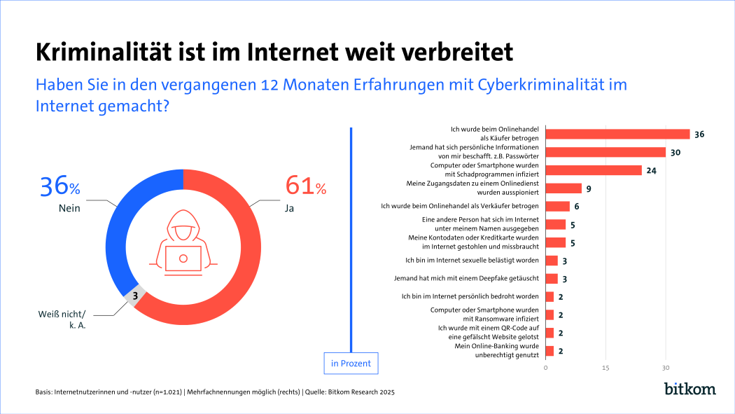 Berlin, 04. März 2025 - Die Mehrheit der Internetnutzerinnen und -nutzer in Deutschland ist in den vergangenen 12 Monaten Opfer von Cyberkriminalität geworden. 61 Prozent haben damit persönlich Erfahrung machen müssen, 36 Prozent blieben verschont. Das ist das Ergebnis einer repräsentativen Befragung von 1.021 Personen ab 16 Jahren in Deutschland, die das Internet nutzen, im Auftrag des Digitalverbands Bitkom. Damit setzt sich ein leicht rückläufiger Trend fort. Vor einem Jahr hatten noch 67 Prozent angegeben, Opfer von Cyberkriminalität geworden zu sein, vor zwei Jahren waren es sogar 75 Prozent. „Die Bedrohungslage im Internet verschärft sich, die rückläufigen Zahlen deuten darauf hin, dass die Menschen aufmerksamer sind und sich besser schützen“, sagt Bitkom-Präsident Dr. Ralf Wintergerst. „Aber weiterhin wird eine deutliche Mehrheit der Deutschen jedes Jahr Opfer von Cyber-Kriminellen. Wir müssen unsere Anstrengungen für Cybersicherheit erhöhen, im Privaten und in den Unternehmen. Außerdem müssen unsere Behörden so ausgestattet werden, dass sie Kriminalität im Netz mindestens so gut bekämpfen können wie in der analogen Welt.“