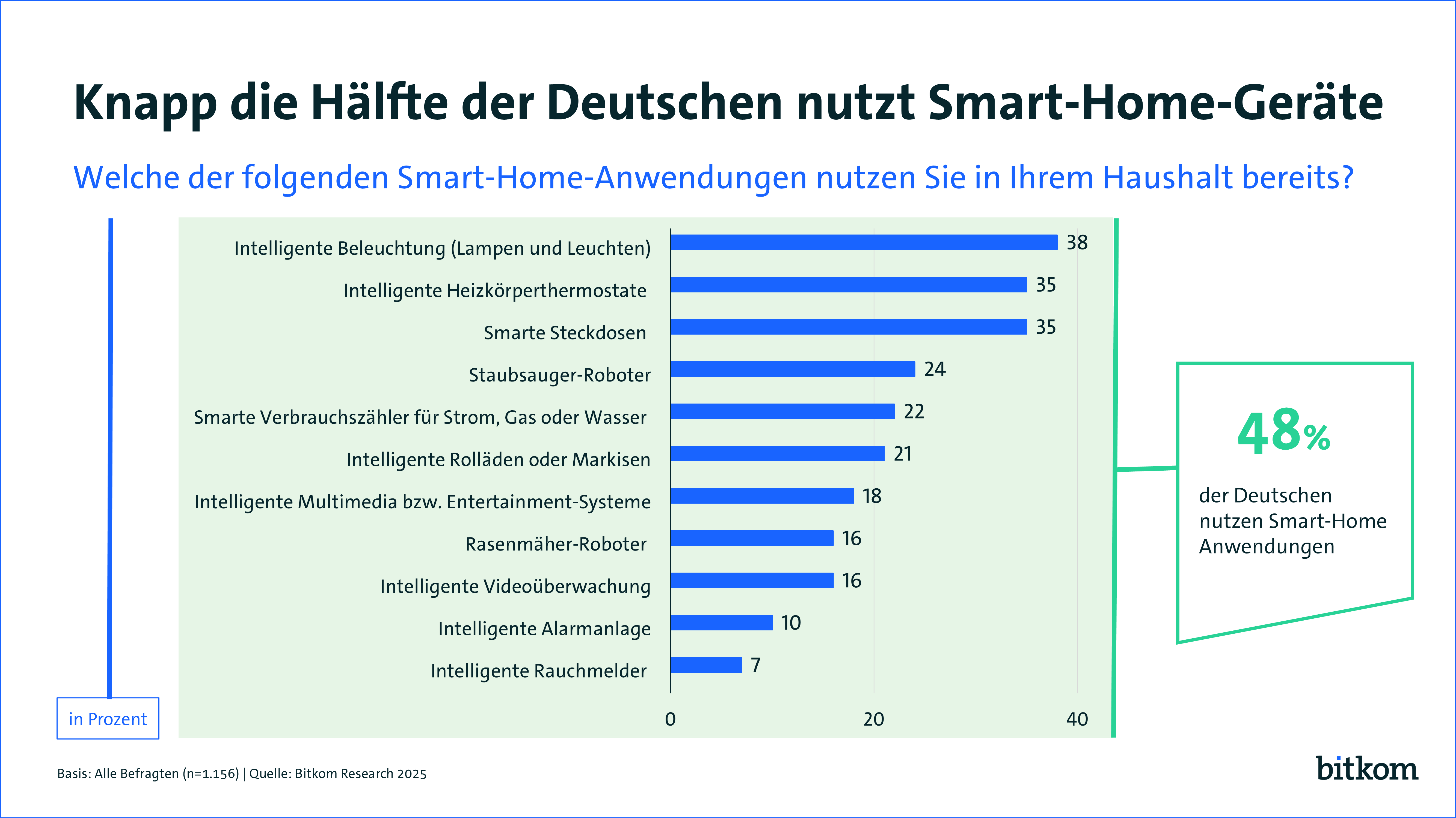 Berlin, 15. Dezember 2025 – Ein Bewegungssensor schaltet bei Inaktivität die intelligente Beleuchtung ab, das smarte Thermometer regelt die Raumtemperatur, ein Roboter hält das Haus sauber – fast jeder zweite Haushalt in Deutschland ist mittlerweile smart: 48 Prozent der Deutschen geben an, im eigenen Zuhause mindestens eine Smart-Home-Anwendung zu nutzen. Von ihnen greifen 59 Prozent sogar auf mehr als fünf smarte Lösungen zurück. Die Nutzungszahlen steigen im Vergleich zu den Vorjahren noch einmal leicht an: 2022 waren es 43 Prozent, 2023 44 Prozent und 2024 46 Prozent, die zumindest Teile ihres Zuhauses smart ausgerüstet haben. Das sind Ergebnisse einer repräsentativen Befragung unter 1.156 Personen ab 16 Jahren in Deutschland im Auftrag des Digitalverbands Bitkom.
